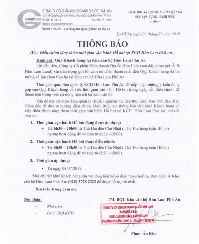 V/v điều chỉnh tăng thêm thời gian vận hành hồ bơi tại KCH Him Lam Phú An